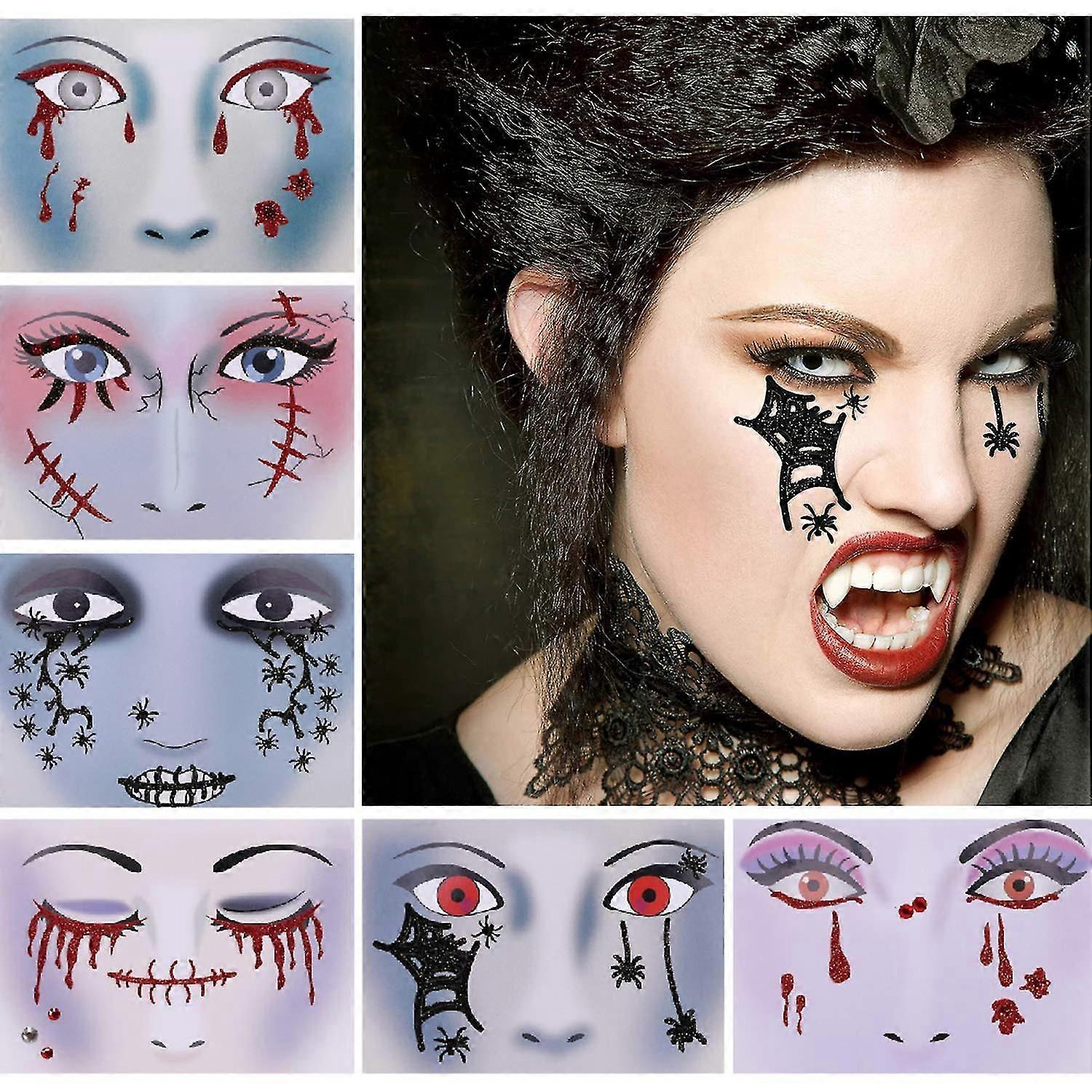 Halloween Glitter Face Temporary Tattoos (6 Pack), Day of the Dead Bloody Scars Black Spider Face Tattoo Sticker