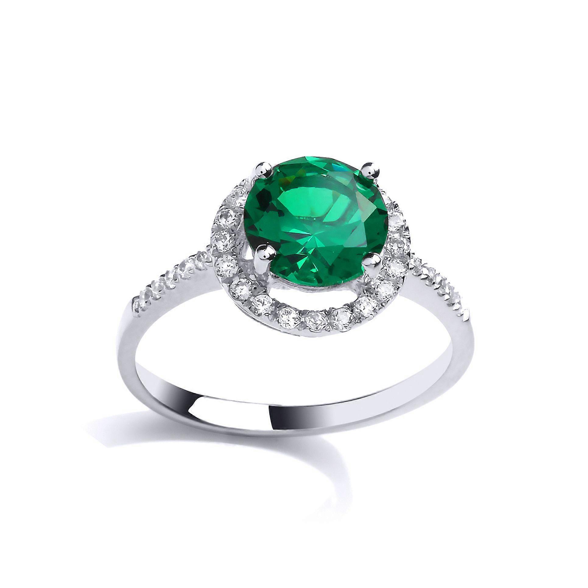 Jewelco London Ladies Sterling Silver Emerald-Green Cubic zirconia Shoulder-Set Halo Solitaire Engagement Ring