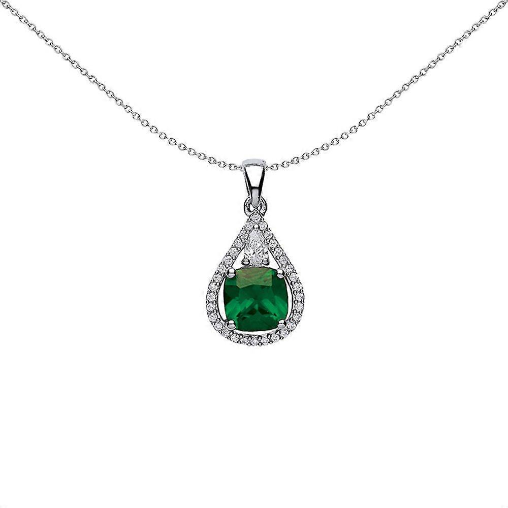 Jewelco London Ladies Sterling Silver Emerald-Green Cushion Cubic Zirconia Halo Teardrop Pendant Necklace 18 inch