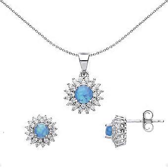 Jewelco London Ladies Sterling Silver Blue Opal Sunshine Cluster Solitaire Earrings Necklace Set