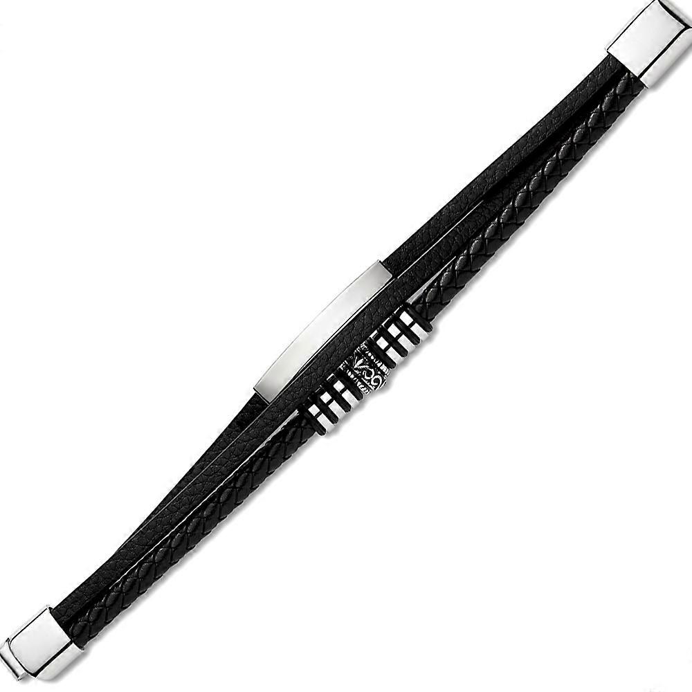Jewelco London Mens Rhodium Plated Stainless Steel Black Leather ID Bracelet 13mm 8.5 inch