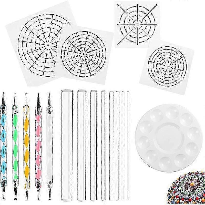 A complete set of tool - Our product includes Paint Tray, Mandala Stencils with different sizes, Acrylic Rods with sizes and Double Sided Dotting Tools. They can meet your multiple needs and are fit for beginners Quality and easy to clean - Transparent Acrylic Rods are smooth and feel comfortable; so they are fit for stippling on the of rocks, paper, canvas, etc. In addition, they are easy to clean and they can be used repeatedly, which is convenient and economical Wide application - Our product can be used in many situations such as stippling on the paper, wood, canvas, fabric, metal, furniture, wall art, etc Size - Acrylic Rods: the length of them is 5.91 inches and the diameters, 0.12, 0.16, 0.2, 0.24, 0.31, 0.39, 0.47, 0.59 inches. Double Sided Dotting Tools: the length of them are 5.12 inches; the diameters of the big ball are 0.12, 0.1, 0.08, 0.04, 0.03 inches and the diameter of the small ball, 0.06 inches. Mandala Stencil: 7.87 x 7.87 inch, 5.91 x 5.91 inch, 5.31 x 5.31 inch. Paint Tray: the diameter of it is 6.69 inches. Various choices are provided Safe and quality material - Acrylic Rods are made of acrylic; the pen-holder of the Double Sided Dotting Tools is made of acrylic and the pen-point is made of stainless iron; the Mandala Stencil, PVC and the Paint Tray, plastics Art assistant: Double Sided Dotting Tools are perfect tools for making dots, clay seam, paper flowers, flower modes of fondants, nail design and more. Clever design - The round Paint Tray has 10 and 1 central reservoir, which offers convenience to you to mix colors or use only one color. What's more, it is reusable and easy to use. templates style: random style,don't accept the specified style colour: random colors,don't accept the specified color Material: Acrylic + plastic size: 18 * 16 * 2.5cm Package Contents: 8*acrylic sticks 4*templates 5*point drill pens 1*color palette Notice: The children under 5 years old must be supervised by adults in case that children may be hurt by the pen point. Only the above package content, other products are not included. Note: Light and different displays may cause the color of the item in the picture a little different from the real thing. The measurement allowed error is +/- 1-3cm.