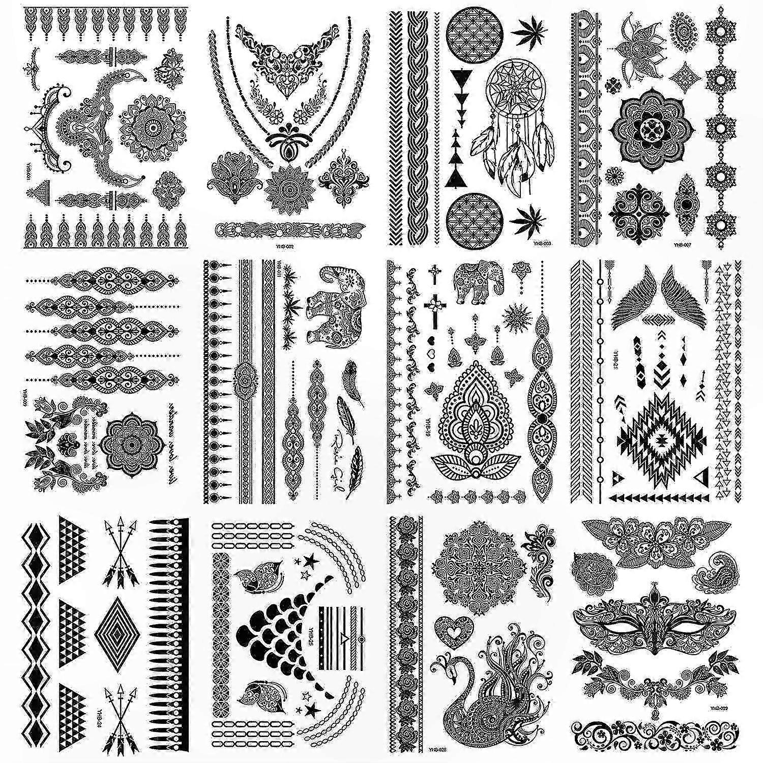 Mandala Lace Chain Temporary Tattoos for Women, Black Henna Stickers for Parties & Festivals