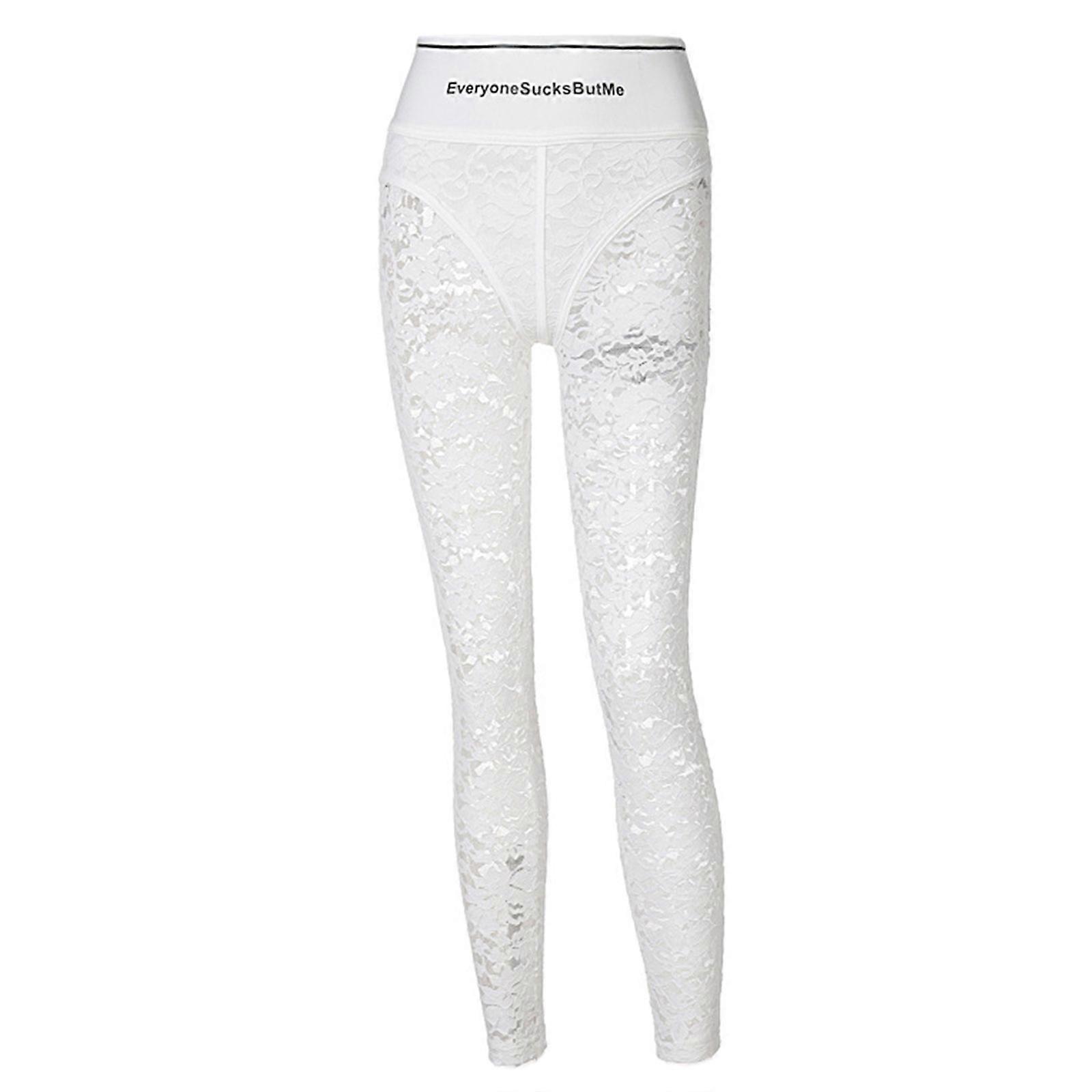 Women Letters High Waist Mesh Leggings Sexy Hollow Out Floral Lace Tights Pants