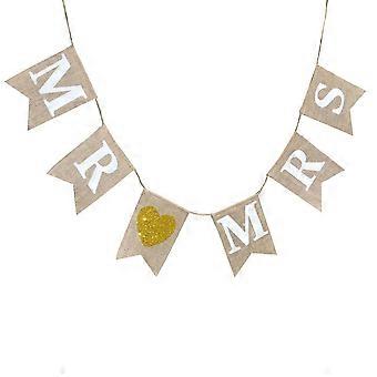 MR MRS Hanging Flag Hessian Jute Banner Golden Heart White Letters for Wedding Party Decor