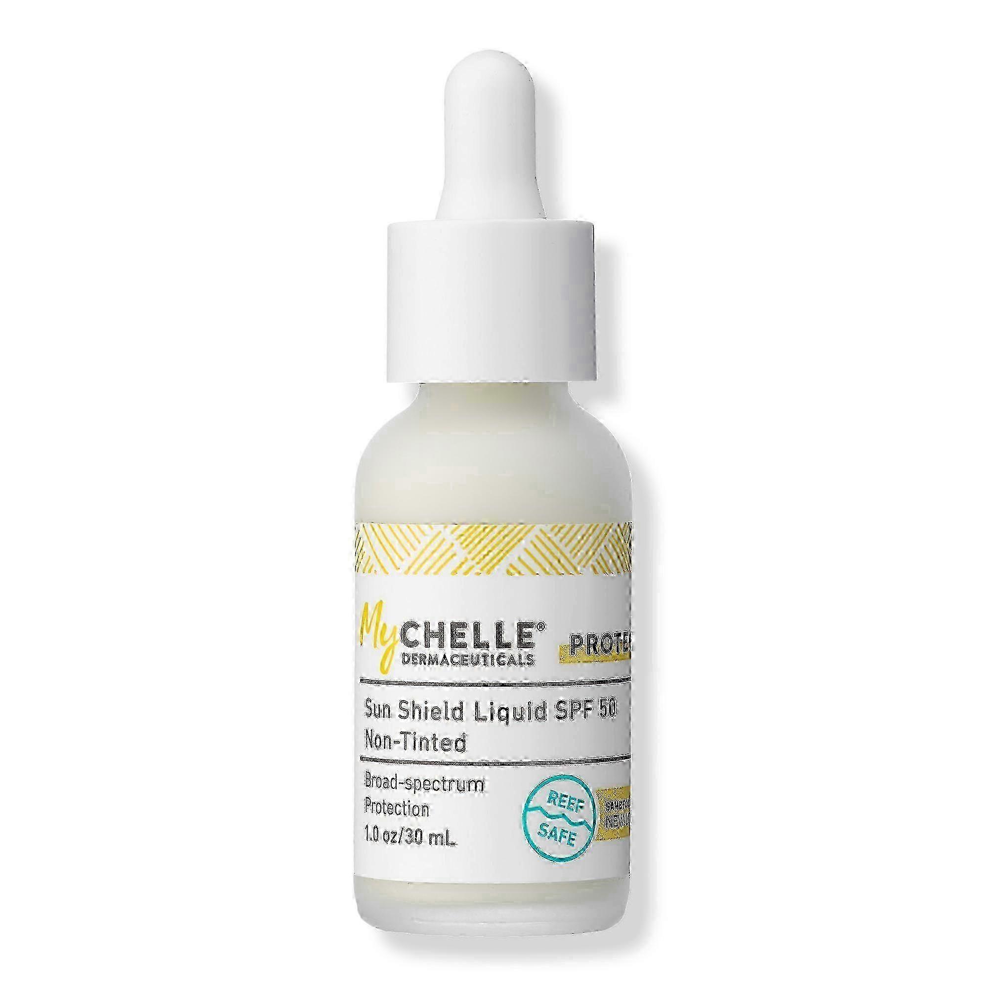 MyChelle's Non-Tinted Sun Shield Liquid SPF 50 features a sheer non-tinted, oil-free formula with 100% mineral broad-spectrum protection. Blends weightlessly and seamlessly giving skin a fresh, healthy glow with a smooth, matte finish.BenefitsUnscentedReduces PhotoagingUVA/UVB Broad Spectrum ProtectionMineral-basedFeatures20.5% Zinc OxideReef SafeClean Label Project CertifiedVeganCruelty-freeFormulated WithoutParabensPetroleumPhthalatesSiliconesSulfatesUreasArtificial FragrancesArtificial ColorsSuggested Use: Shake well before use. For daily use, apply to clean, dry skin and allow to absorb completely before applying makeup. Apply liberally and evenly 15 minutes before sun exposure. Use a water resistant sunscreen if swimming or sweating. Reapply at least every 2 hours. Sun Protection Measures: Spending time in the sun increases your risk of skin cancer and early skin aging. To decrease this risk, regularly use a sunscreen with a broad-spectrum SPF of 15 or higher and other sun protection measures including: Limit time in the sun, especially from 10 a.m. - 2 p.m. Wear long-sleeve shirts, pants, hats and sunglasses. Children under 6 months: Ask a doctor. Precautions: For external use only. Do not use on damaged or broken skin. When using this product keep out of eyes. Rinse with water to remove. Stop use and ask a doctor if rash and irritation develops and lasts. Keep out of reach of children. If swallowed, get medical help or contact a Poison Control Center right away.Expiration Date: We have fresh stock each week with exceptional expiration dates prior to APRIL 2024. Products will expire no later than six months to 1 year after receipt.Product Packaging: Please note that some manufacturer may often change their packaging. This product may arrive different from what is pictured. We will always ship the most up-to-date packaging to our customers. Please contact us if you have any questions about this product or would like to request an older version of this product.Healthcare Disclaimer: Content on this site is for reference purposes only. OTC Shoppe Express does not represent or warrant that the nutrition, ingredient, allergen and other product information on our Web or Mobile sites are accurate or complete, since this information comes from the product manufacturers. On occasion, manufacturers may improve or change their product formulas and update their labels. We recommend that you do not rely solely on the information presented on our Web or Mobile sites and that you review the product's label or contact the manufacturer directly if you have specific product concerns or questions. If you have specific healthcare concerns or questions about the products displayed, please contact your licensed healthcare professional for advice or answers.