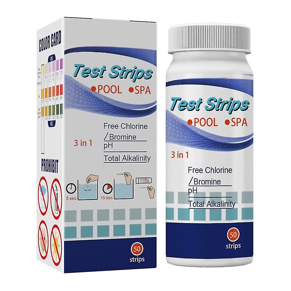 Pack of 50 3-in-1 pool water quality test strips for alkalinity, chlorine, pH and free chlorine.
