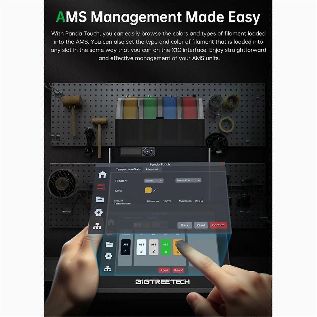 Panda Touch advantage: Plug & Play: Unbox and start creating effortlessly.Customized UX&UI System: Experience interface that mirrors the factory interaction.5-inch Touch Screen: A sleek and responsive display for intuitive control. Compatibility:For X1, P1, and A1 series printers WiFi Connectivity: Wireless Connection for convenience and flexibility. Multiple Printer Control: Control multiple 3D printers simultaneously.Magnetic Charging: Equipped with a built-in lithium battery, it can be effortlessly through the magnetic base, allowing for portable use. Product Name:Panda Touch;Screen Size:5inch;Display:Full-view IPS with 16.7M colors IMPORTANT NOTE: The Panda Touch is currently compatible with all printer firmware versions up until: - P1P v01.07.00.00 - P1S v01.07.00.00 - X1C v01.08.02.00 - X1Ev01.01.02.00 - A1 v01.03.01.02 - A1 Miniv01.04.00.00 It is possible that may release a firmware version which impacts the functions the Panda Touch. monitor all beta firmware versions and if we find a firmware version that affects Panda Touch functionality we send out an alert via email, chat and our social channels. can then decide whether or not they would like to perform the update at the risk of losing functionality. Note that the Panda Touch does not cover lost functionality due to a firmware update being performed. Note: The Panda Touch firmware has been updated to V1.0.6.1. Some units may ship with an earlier firmware version. Please check your firmware version and upgrade to the latest for the best user experience. Operating Temperature Range:0-60 Logic Voltage:3.3V Charging Time:1.2 hours Colour:black Material:Metal + Plastic Due to different batches,there may be differences in product appearance and printed text,which not affect use Package Contents:1 x Panda Touch1 x fixed bracket1 x Charging base1 x Charging cable1 x inner hex wrench4 x screws Only the above package content, other products are not included.Note: Light reflection and different displays may cause the color of the item in the picture a little different from the real thing. The measurement allowed error is +/- 1-3cm.