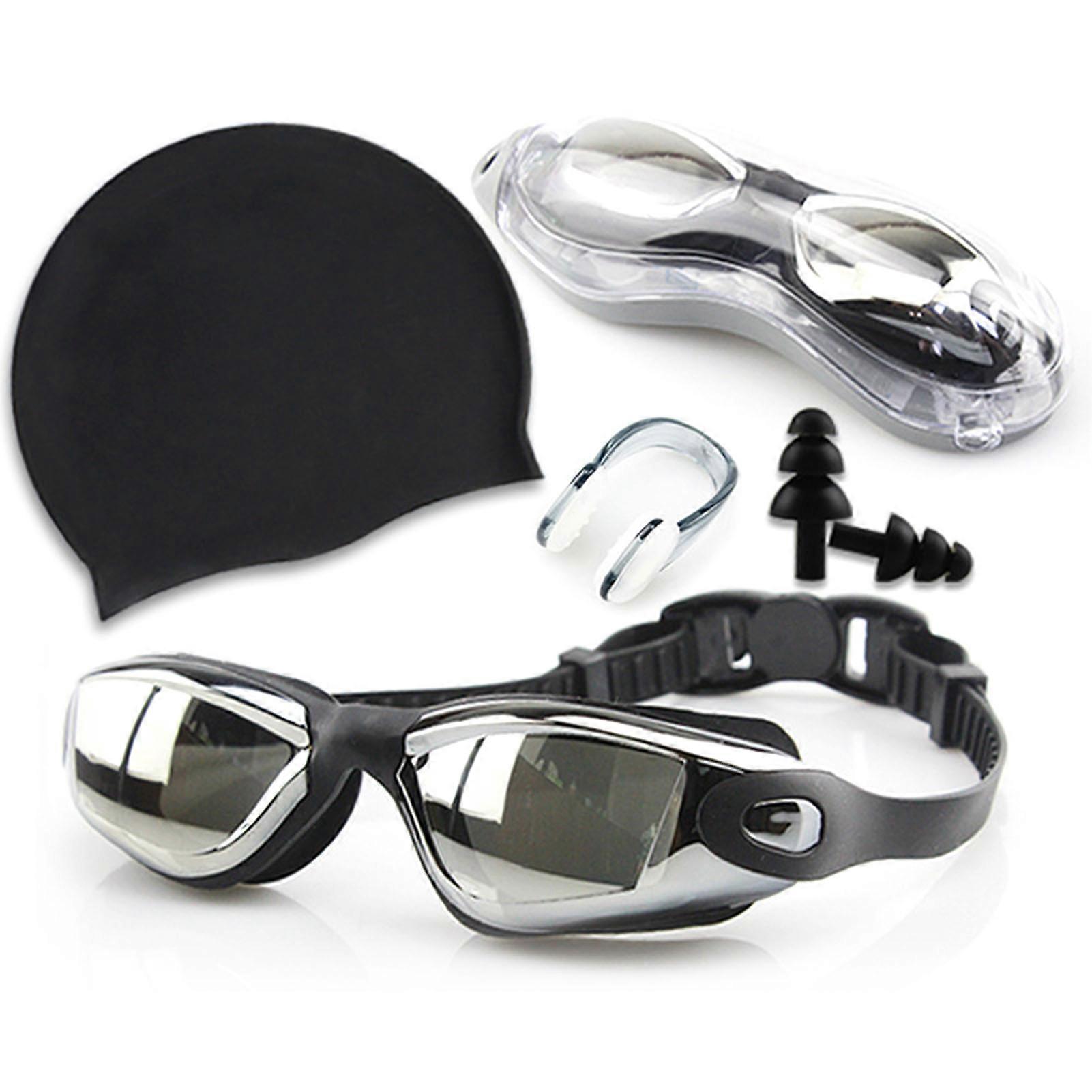 Swimming Goggles Cap Set Black Silicone and PC Lens Swimming Ear Plugs Nose Clip Kit for Adults