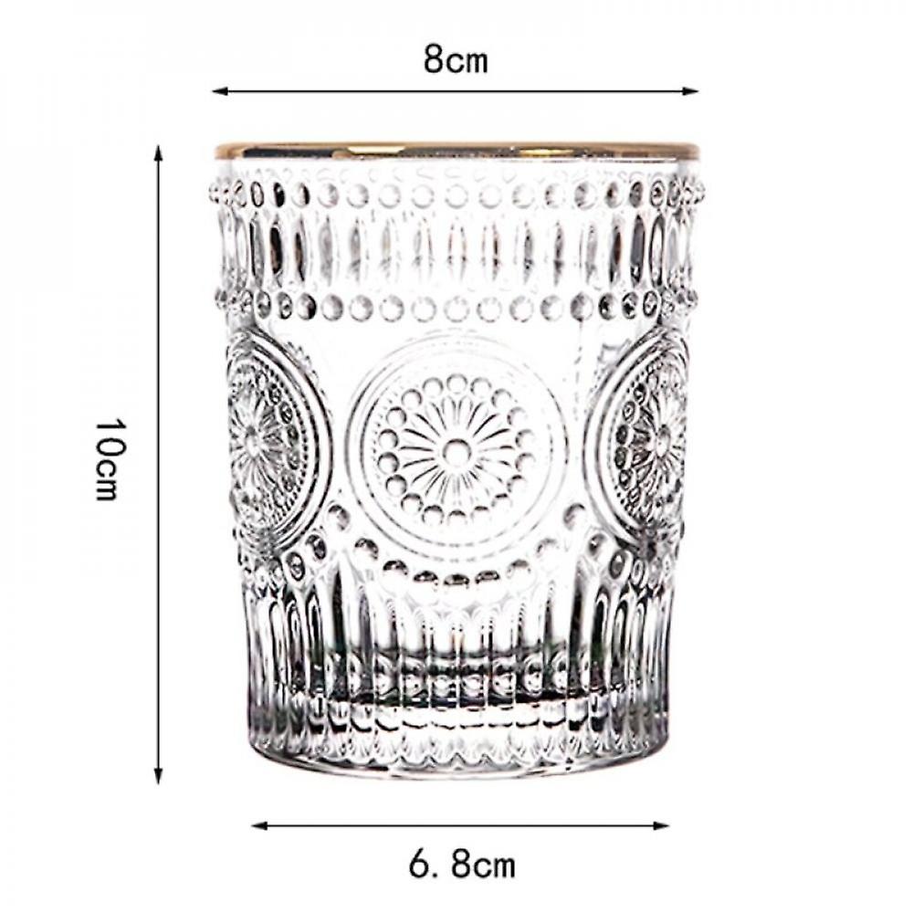 Product Description: Material: Glass Capacity: 260ml/340ml Color: Gold, White Size: 12.6 * 8 * 6.7 cm(340ml)/10 * 8 * 6.8 cm(260ml) Product Net Weight: 0.26 Kg Use Scene: Bar/restaurant/party Package Size: 13.2 * 8.2 * 8.2 Cm/10.7 * 8.5 * 8.5 Cm Packing Method: Carton Package Included: 1PC X  Cup Note: 1. Please Allow 1-3 Cm Difference Due to Manual Measurement and 3-5 Grams, the Difference Between Different Colors. 2. Due to Screen Differences, the Color May Be a Little Different from What You Expect, Please Allow It EXQUISITE RELIEF DESIGN: These uniquely designed pretty glass with flowers patterns, which makes them easy and comfortable in the hand and enjoyable to drink from. DURABLE HEAVY-DUTY GLASS: Glass are made of Superior thick glass, its especially thick at the rim - super sturdy and well weighted. GORGEOUS PRESENT: Great for your family and friends for a lovely housewarming or wedding present. Surprise your loved ones with a unique and elegant glassware item that is perfect for a new home and holiday gift. SUITABLE FOR ALL TYPES OF BEVERAGES: For water, Lemonade, wine, beer, cocktails, champagne or whiskey on the rocks. OCCASION: Great gift idea for birthdays, holidays, or weddings. Great for the home but also in a restaurant setting.