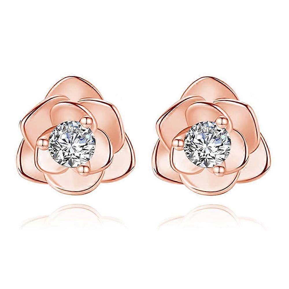 Rose Gold Plated Rose Flower Ear Studs | Dainty Magnolia Flower Earring, Leaf Hypoallergenic Earrings for Women
