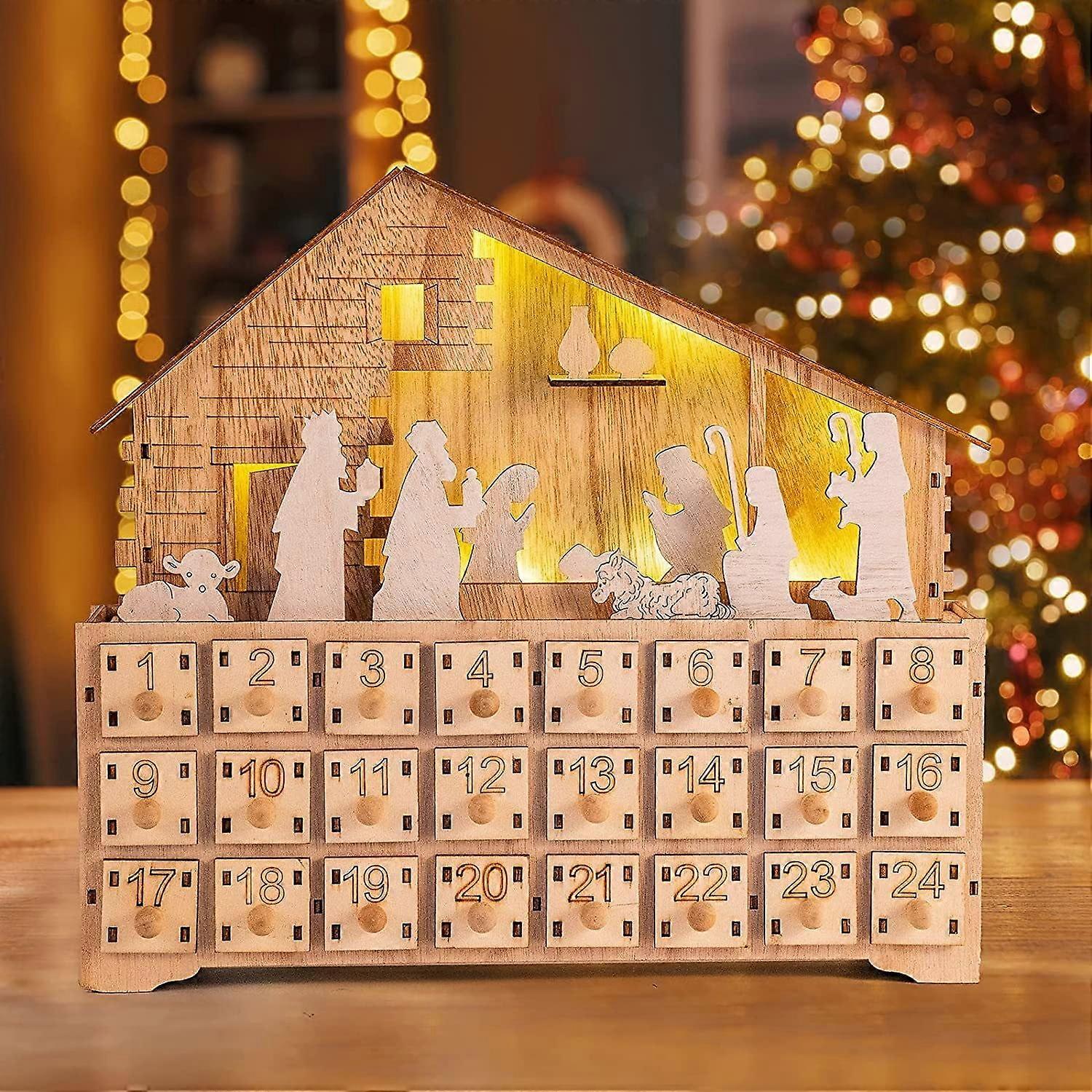Ruhiku GW Christmas LED Wooden Advent Calendar 24 Drawers, 24 Days Countdown Lights Up DIY Empty Box Holiday Decor