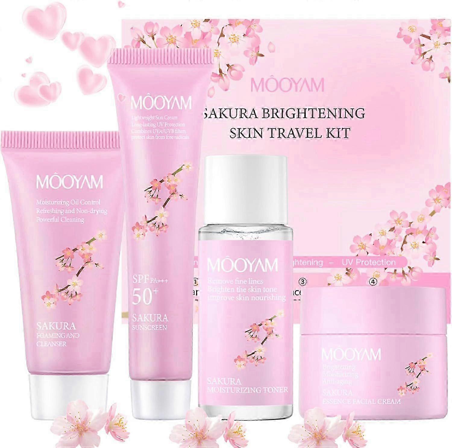 Sakura Skin Care Set - Face Cleanser, Toner, Essence Cream, Sunscreen For Moisturizing Skin, Hydrating Skincare Set Travel Friendly Skincare Mini Set