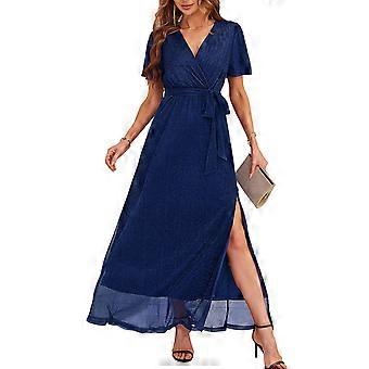 Long V Neck Belted Waist Side Slit Design Fashion Comfortable Women Short Sleeve Dress for Dating Party