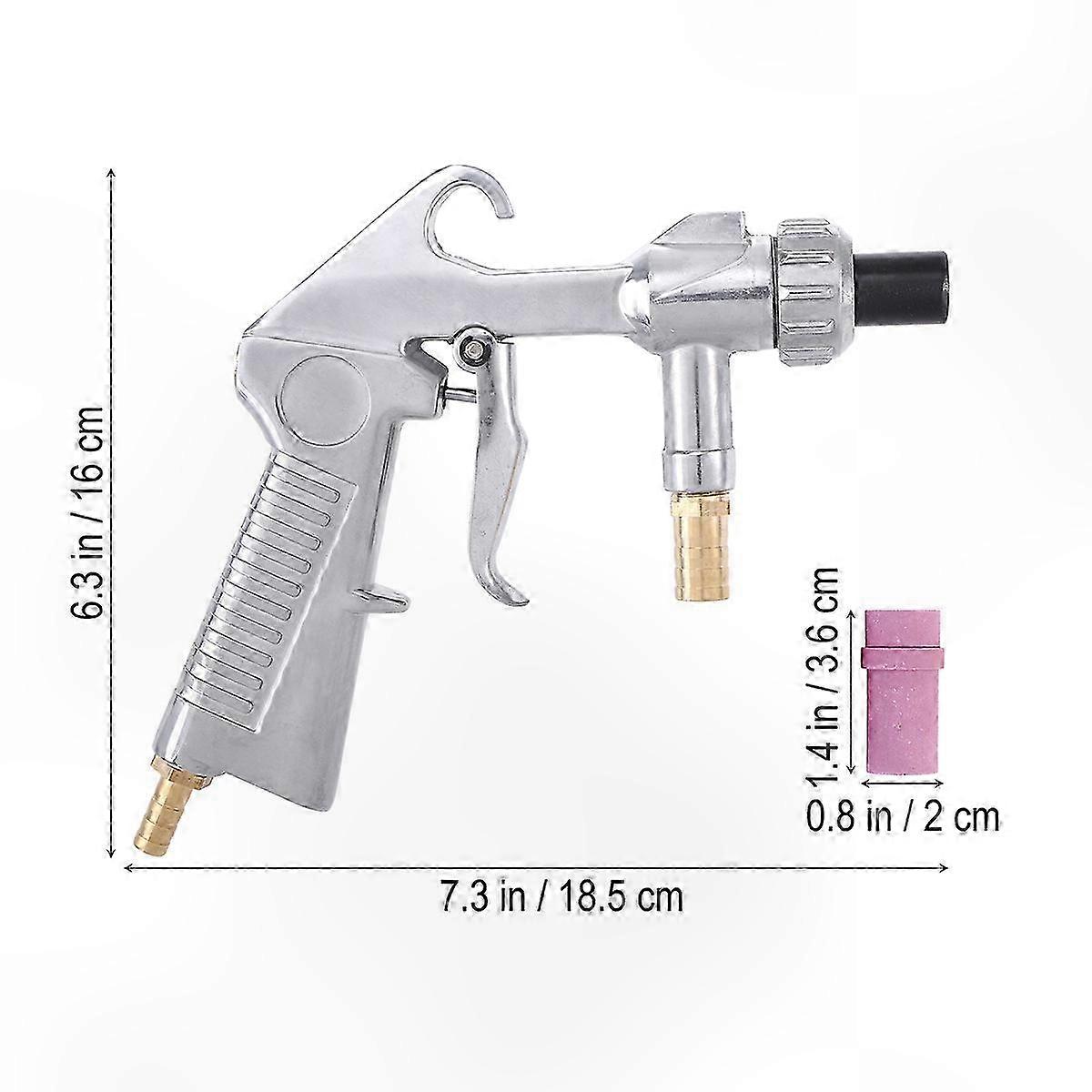 This sandblaster is made of alloy and is highly durable. It is suitable for rust removal on motorcycles, surface cleaning, sandblasting, and surface polishing of machinery parts, aluminum alloy, glass, and other decorative surfaces, as well as marble engraving. Features: - Color: Silver - Material: Alloy - Size: 165 x 155 mm - Nozzle material: Ceramic - Durable construction for long-lasting use - Convenient hook design for hanging - Anti-slip handle - Includes 4 ceramic nozzles (replacing cast iron nozzles) - Wear-resistant and efficient Note: Actual product color may vary slightly due to screen differences. A measurement tolerance of 2–3 cm may apply due to manual measurement. Package includes: 1 x Sandblaster 4 x Ceramic Nozzles