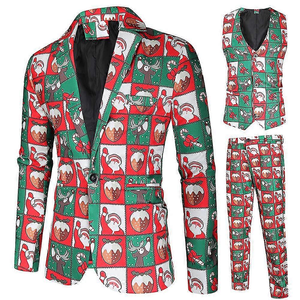 Sliktaa Mens Christmas 3Pce Suit Plaid Print Slim Fit Blazer Vest Trousers