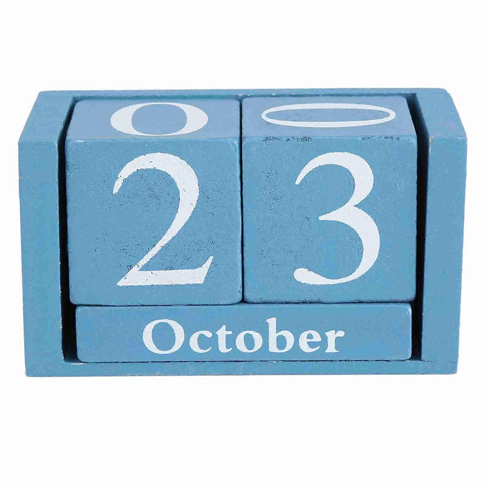 Vintage Wooden Calendar Desktop Wood Block Month Date Display Home Office Decoration Blue