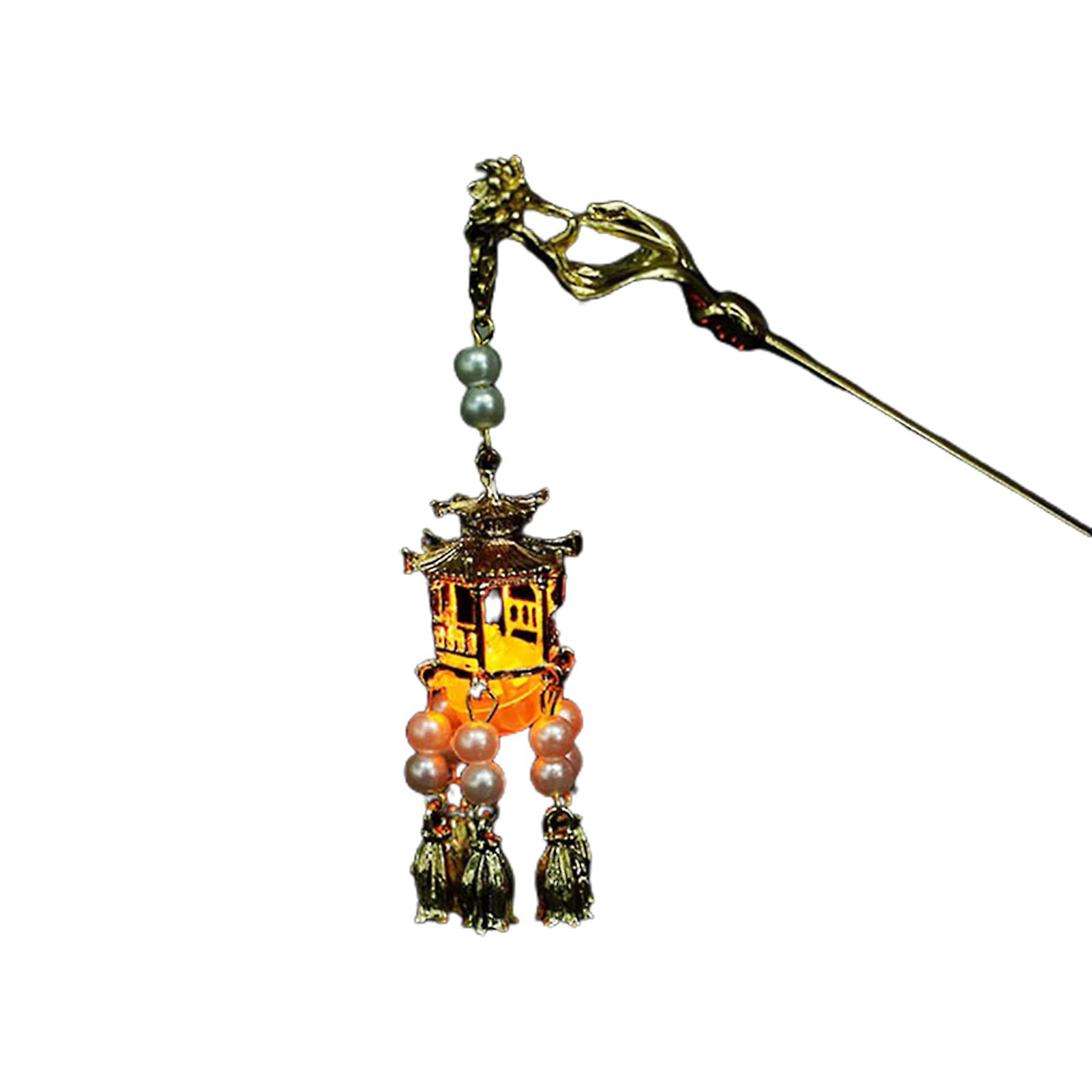 Hair Stick Chinese Pavilion Luminous Vintage Hands Shape Imitation Pearl Decorate Hair Lantern Lightweight Warm Light Lady Hairpin for Performance