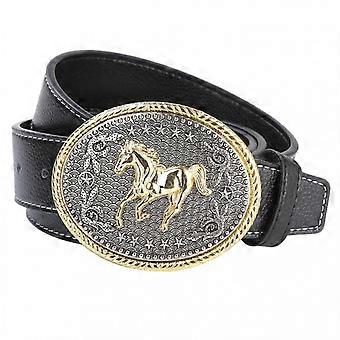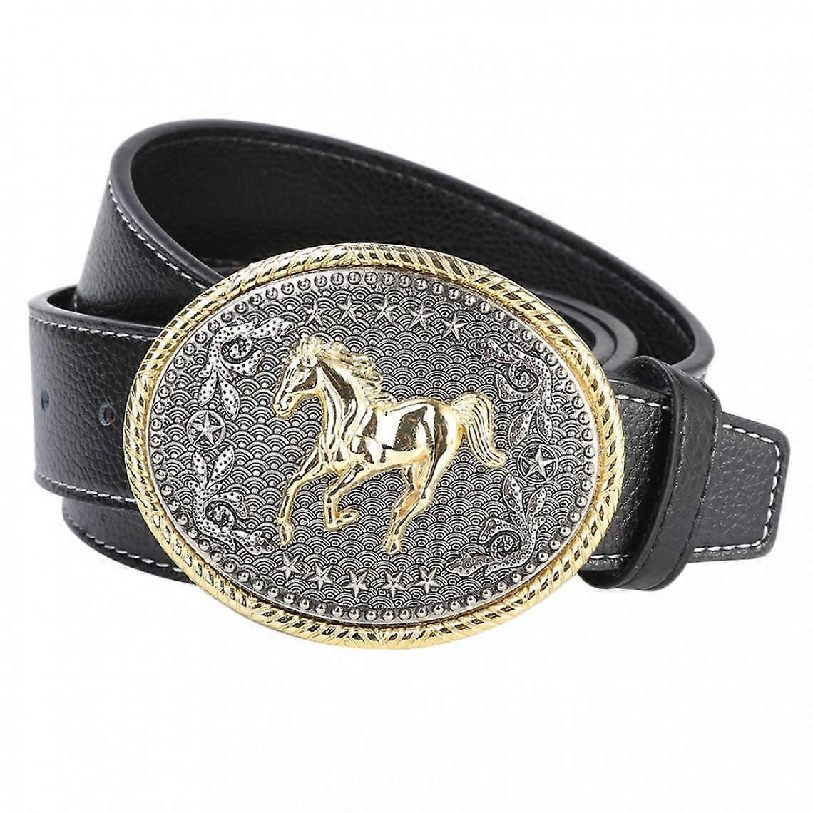 Western Cowboy Men's Fiber Leather Belt with Engraved Race Horse Buckle 110-125cm