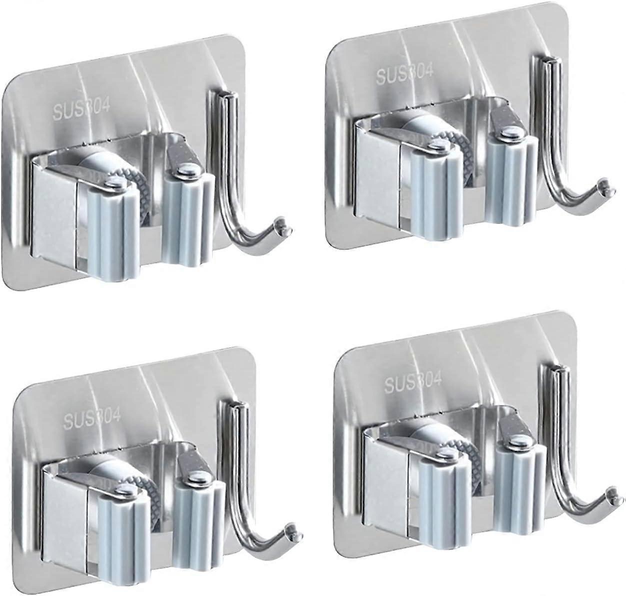 Yzfei 4 Pack Wall Mounted Stainless Steel Self Adhesive Rustproof Broom Holder with 1 Hook and 1 Quick Release C AEF